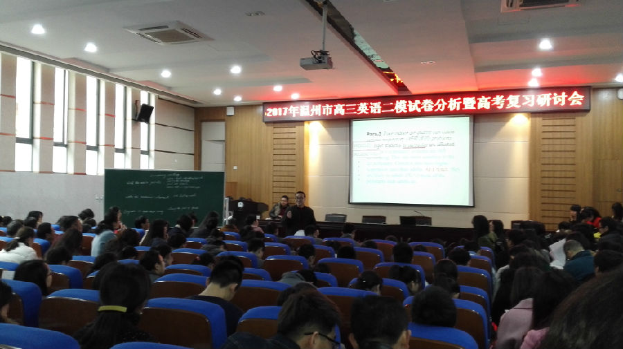316日,温州八高崇德楼罗山厅里,人头攒动,盛况空前——2017年温州市高三英语高考复习研讨会暨郑秋秋名师工作室第三次研修活动在这里隆重举行。来自温州市各县市区300多名高三英语老师代表积极参加了此次活动,不仅过道坐满了与会老师,就连报考厅门口也站满了认真听课的老师。