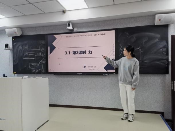 第二节课是来自温州市第八中学林冬冬老师执教的九年级复习课《力》。林老师以“弹簧测力计制作”为核心任务,将理论知识与实践操作紧密结合。学生通过设计、评价改进、拓展应用等环节,系统复习弹力、重力、摩擦力等核心概念,体现“用中学”的教学理念。