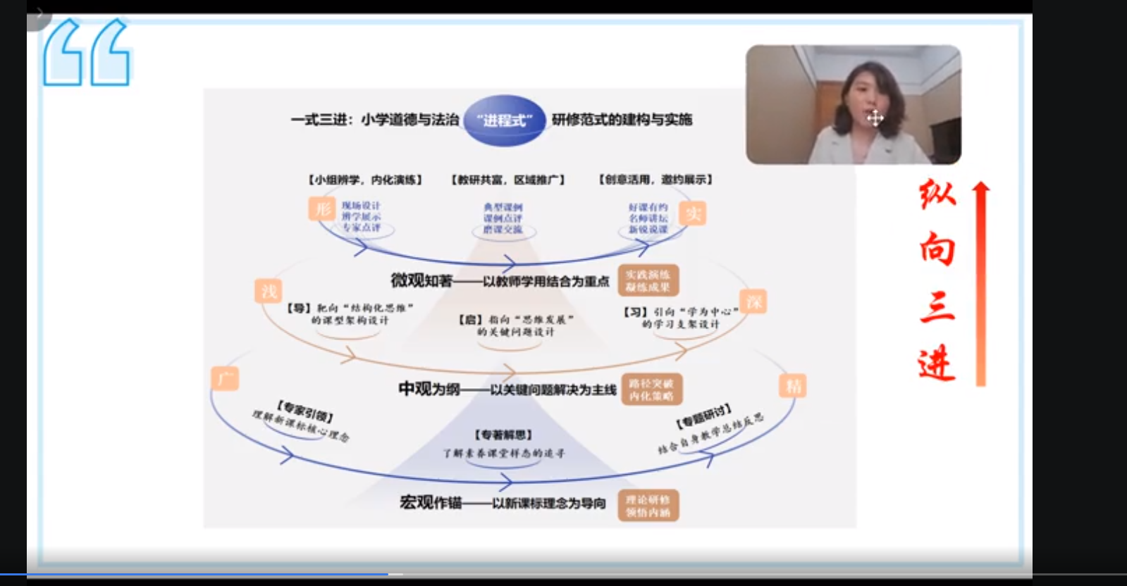 随后,姜老师分享了龙湾区小学道德与法治研修过程中遇到的困境,包括教师队伍以兼任为主、缺乏专业背景和时间精力、新课标理念理解不到位、教学设计能力不足等问题。针对这些困境,她提出了“进程式研修范式”的破局之策,强调从宏观、中观、微观三个层面逐步提升教师的教学活动设计能力。