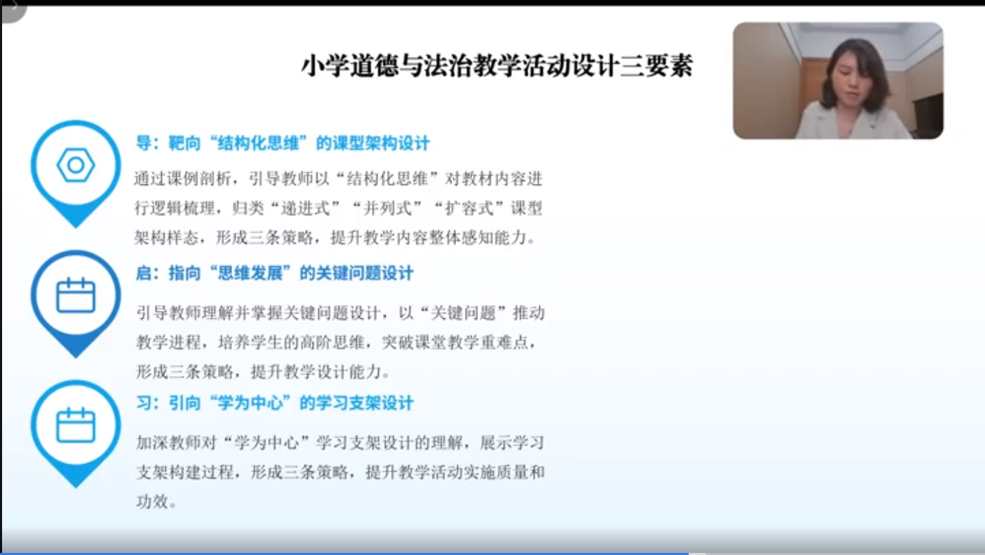 姜老师又介绍了进程式研修范式的实施与运用。他从理论研修领悟内涵、路径突破内化策略、实践冶炼凝练成果三个方面进行了阐述。特别是在中观层面,他重点介绍了“小学道德与法治教学活动设计三要素”,即课型架构设计、关键问题设计、学习支架设计,并分享了具体的操作策略和案例。